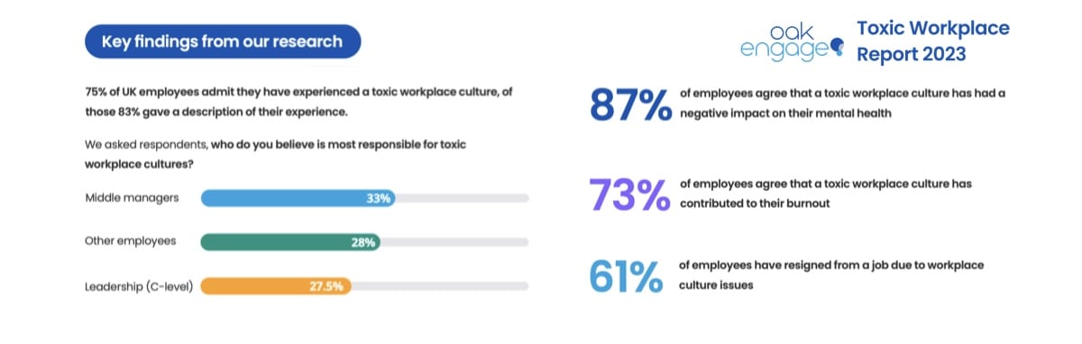 Poor team dynamics often lead to project delays, quality issues, and decreased customer satisfaction, resulting in increased operational costs. In a 2023 Oak Engage Toxic Workplace Report of over 2,000 employees across industries, 75% reported experiencing a toxic workplace culture and said it had a direct impact on their mental health and burnout risk.